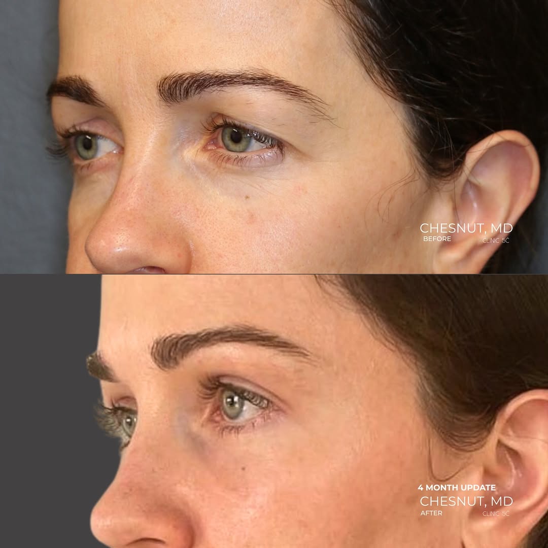The upper eyelid A-frame deformity, the characteristic hollowing that had developed in her upper lids asa consequence of the bony changes in her orbit, required something more specific. To address the bone loss in her orbital area and correct the A-frame deformity, a technique was applied that uses the patient’s own temporal fascia as a structural material to help rebuild the orbital support that had been compromised. This is a technique developed and refined specifically for situations where conventional approaches cannot reach the level of the problem, and it produced a result in Megan’s case that would not have been possible through any other means.